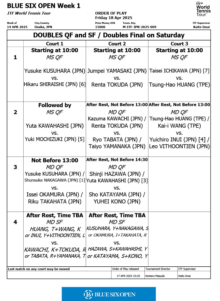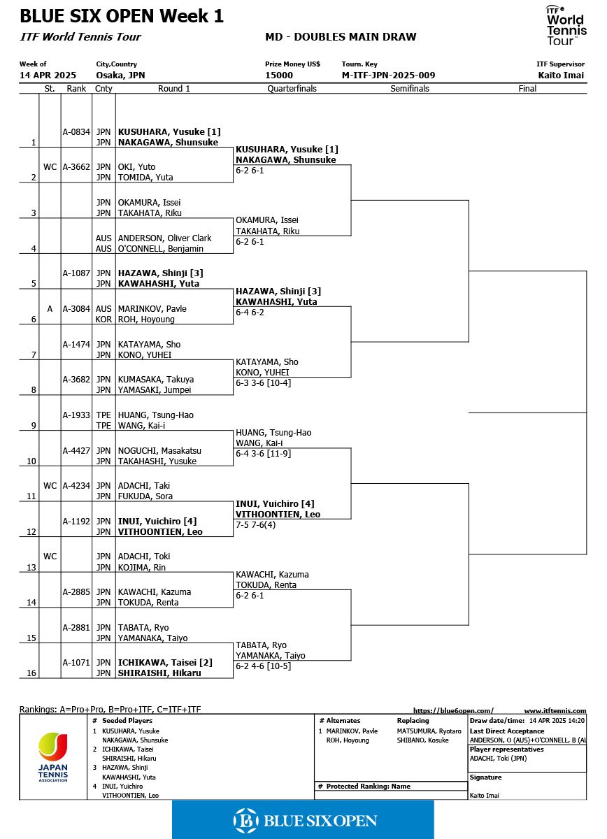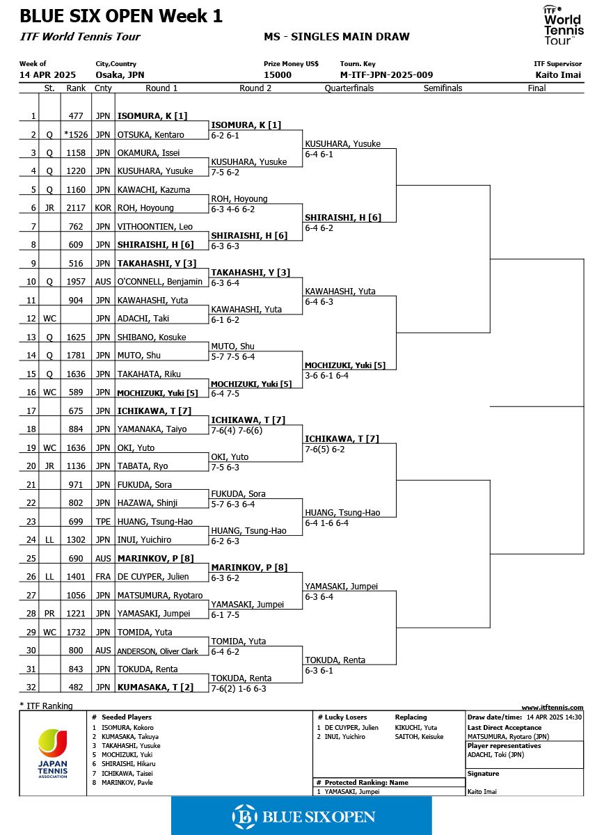 プロテニスプレーヤー内山靖崇がITF男子ツアー計6大会を主催、「BLUE SIX OPEN」大阪大会の本戦進出者が決定
