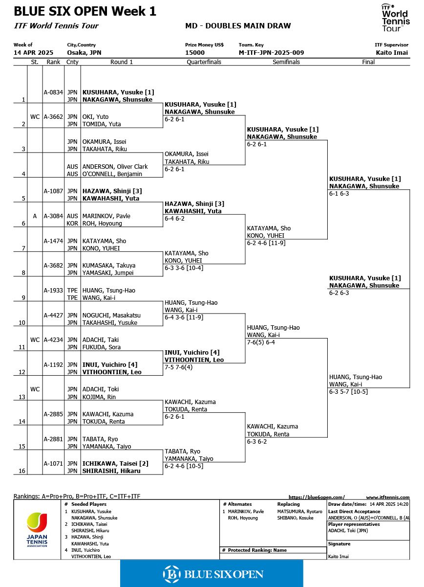 楠原悠介、川橋勇太、山﨑純平がシードダウンを演じて準々決勝進出。単複で8強が出揃う 内山靖崇主催のITF大会「BLUE SIX OPEN」