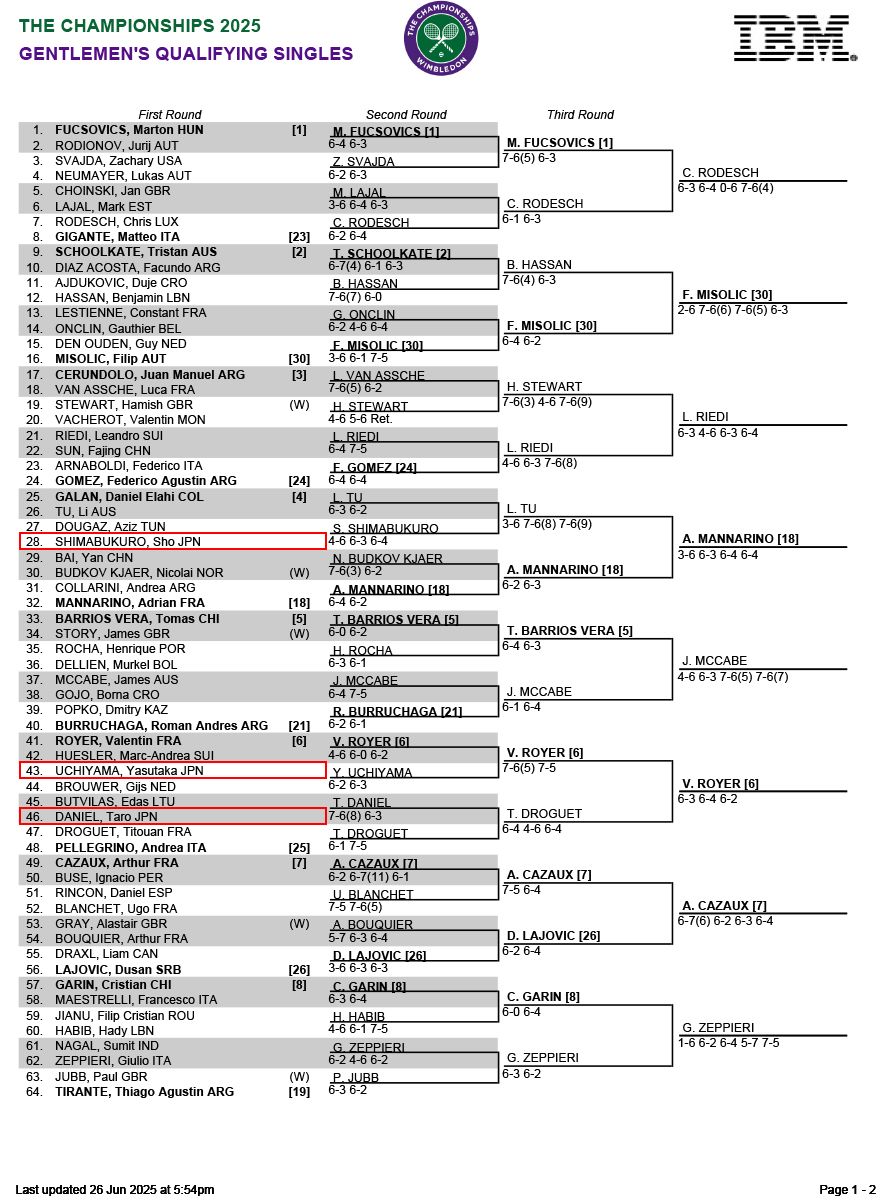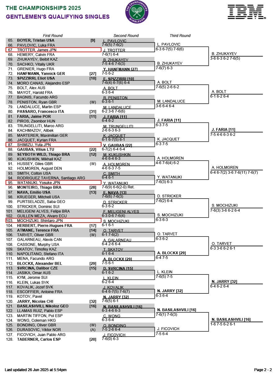 望月慎太郎と綿貫陽介が予選決勝へ。ダニエル太郎、島袋将、トゥロター・ジェームズ、内山靖崇は惜しくも敗れる[ウィンブルドン]