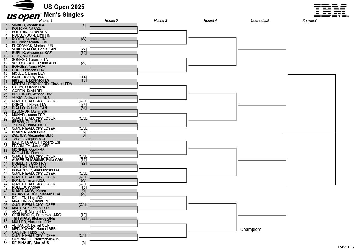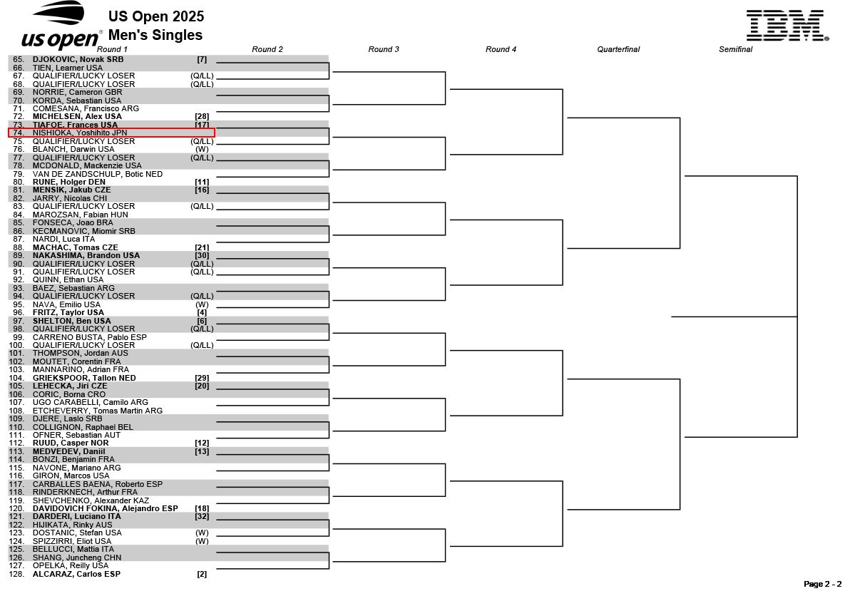 【ドロー】全米オープン2025男女シングルス