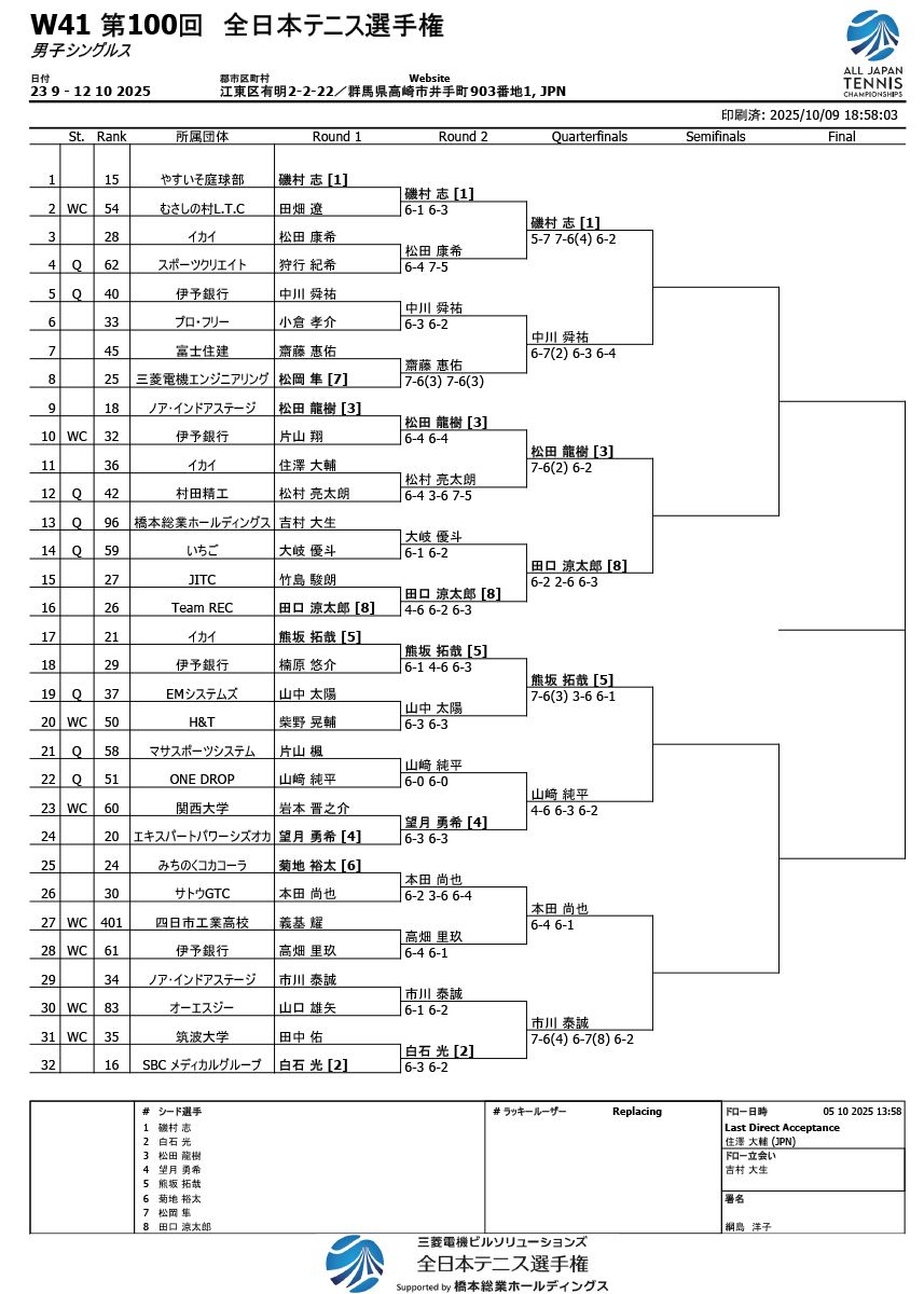 第100回「全日本テニス選手権」の2日目、男子では第1シードの磯村志らが2回戦へ