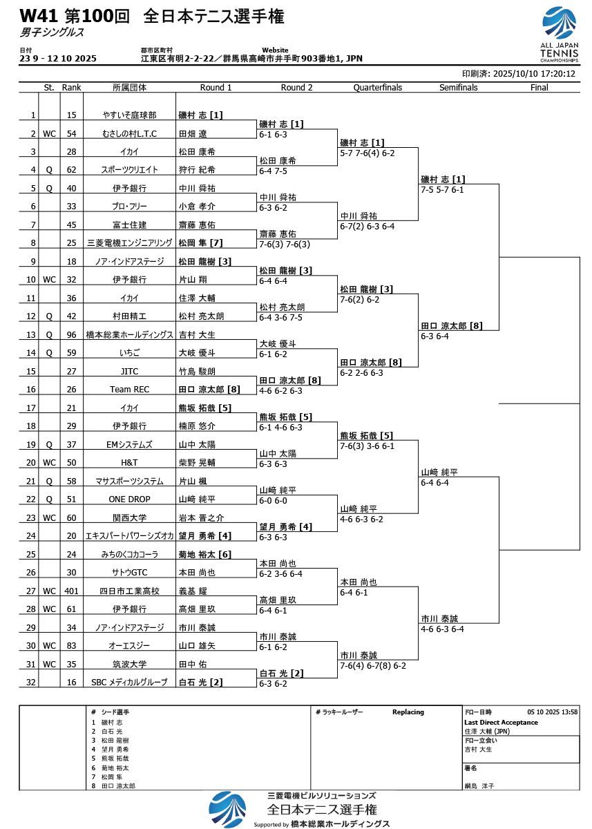 第100回「全日本テニス選手権」の2日目、男子では第1シードの磯村志らが2回戦へ