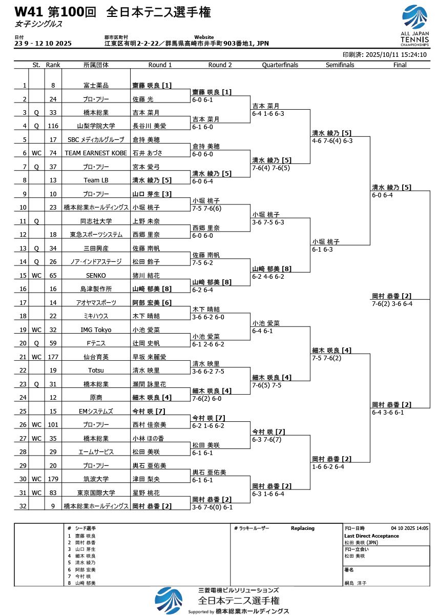 第100回記念大会の「全日本テニス選手権」が開幕!前年準Vの齋藤咲良らが女子シングルス初戦突破