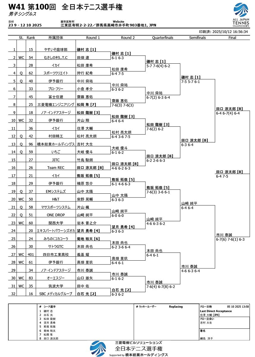 第100回「全日本テニス選手権」の2日目、男子では第1シードの磯村志らが2回戦へ