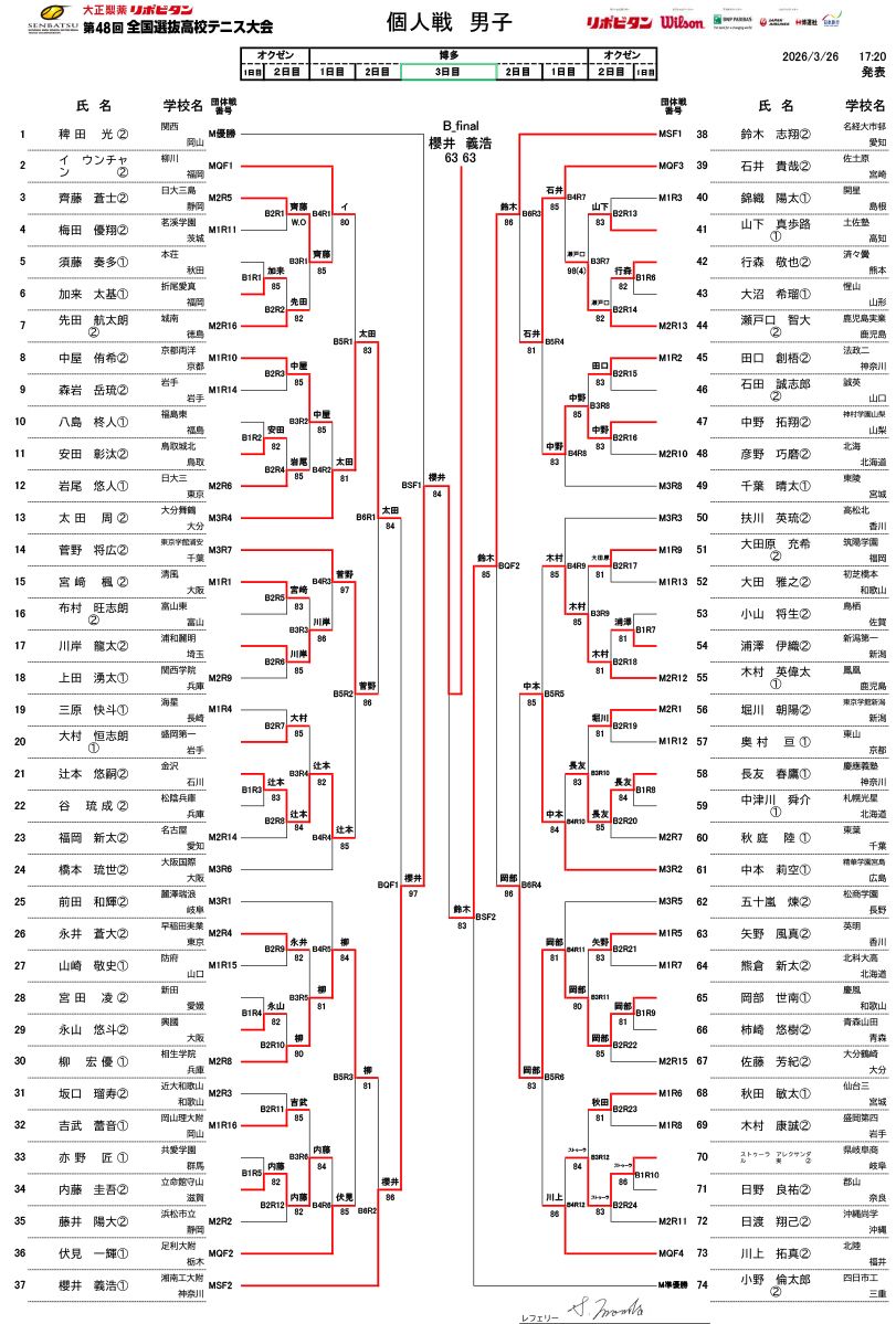 【全国選抜高校テニス】個人戦5回戦が終了、太田周や岡部世南、柳宏優らが勝ち上がる|全米オープンジュニア予選WCを懸けた激戦